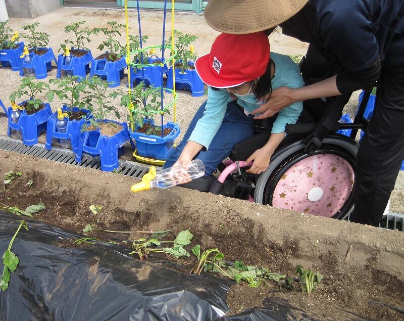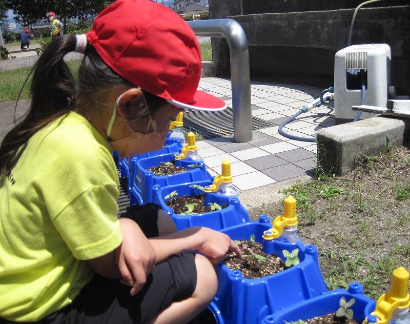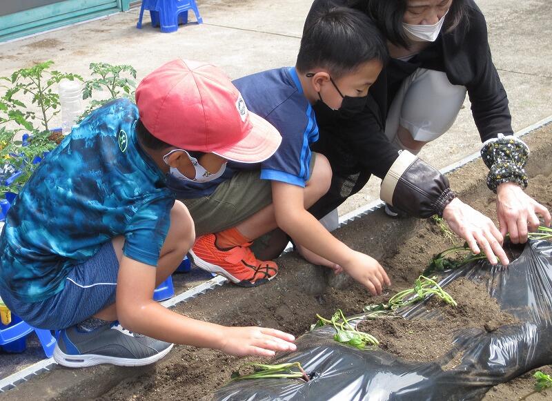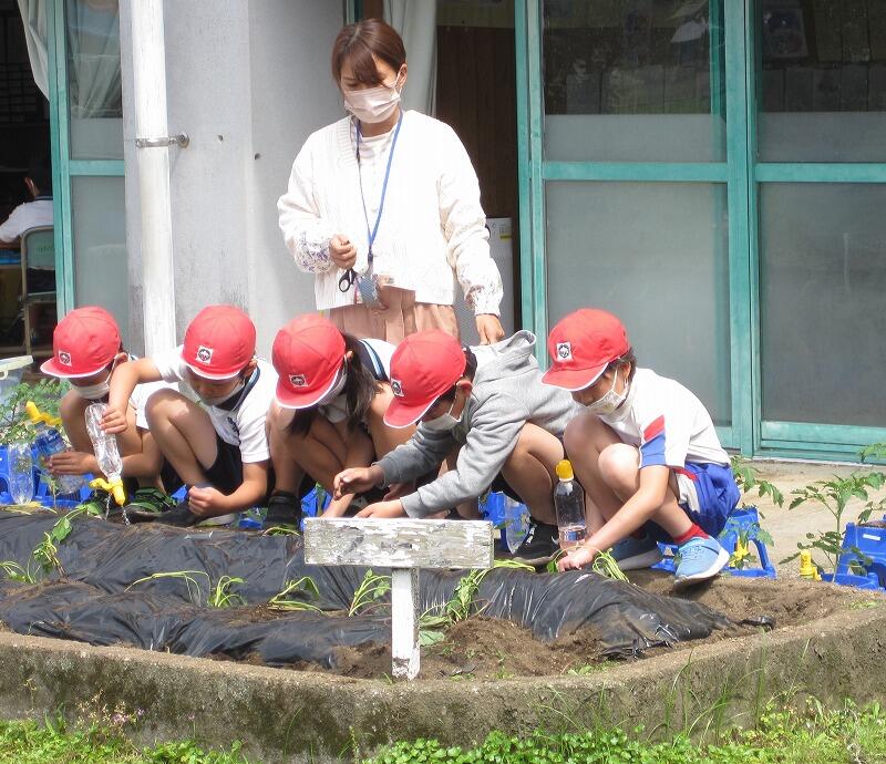 5月19日(木)、2年生が生活科の学習でさつまいもの苗植えをしました。先生から植え方を教えてもらって、苗がななめに入るように植えました。「大きくなってね」と言いながら水やりをしていました。