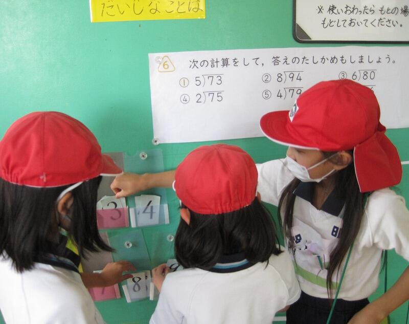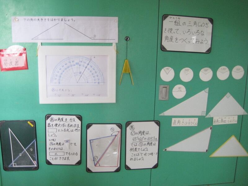 5月31日(火)、4年生以上の算数の授業では1学級を2つに分けて少人数できめ細かな指導ができるようにしています。少人数担当の先生が楽しみながら理解できるように、算数コーナーをつくっています。手に取って動かせる図形やクイズなどを毎月工夫して掲示しています。休み時間に、カードを動かしている子どもの姿をよく見かけます。