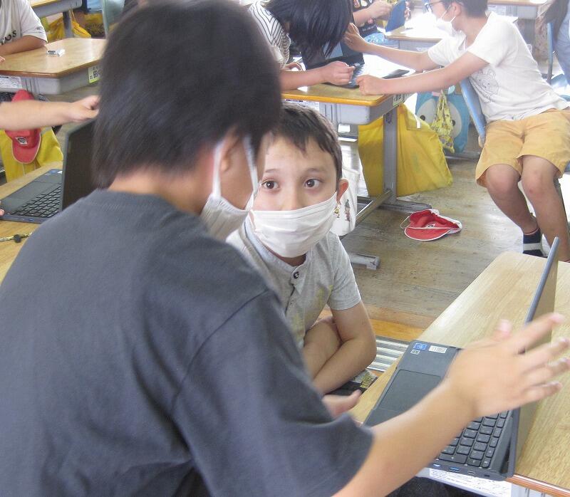 アフガニスタンから転入生が来て2日目、言葉の壁をこえて積極的にコミュニケーションをとっている子ども達です。ジェスチャーはもちろん、タブレットPCの翻訳機能を使って伝え合っている姿には驚きました。紙ひこうきの作り方を教えて一緒に飛ばして遊んだりも・・・