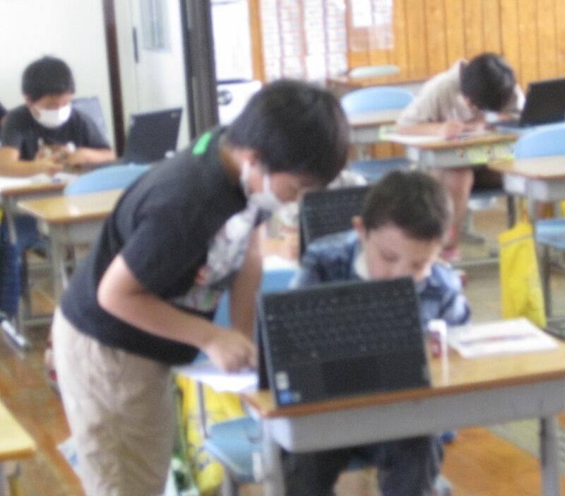 6月22日(水)、集中してAIドリルに取り組んでいる子供たちです。子供の興味や関心、能力、学習進度に応じた問題が出され基礎学力の向上を目指しています。授業中だけではなく雨の日の昼休みや朝の時間など夢中になって取り組む姿が見られます。