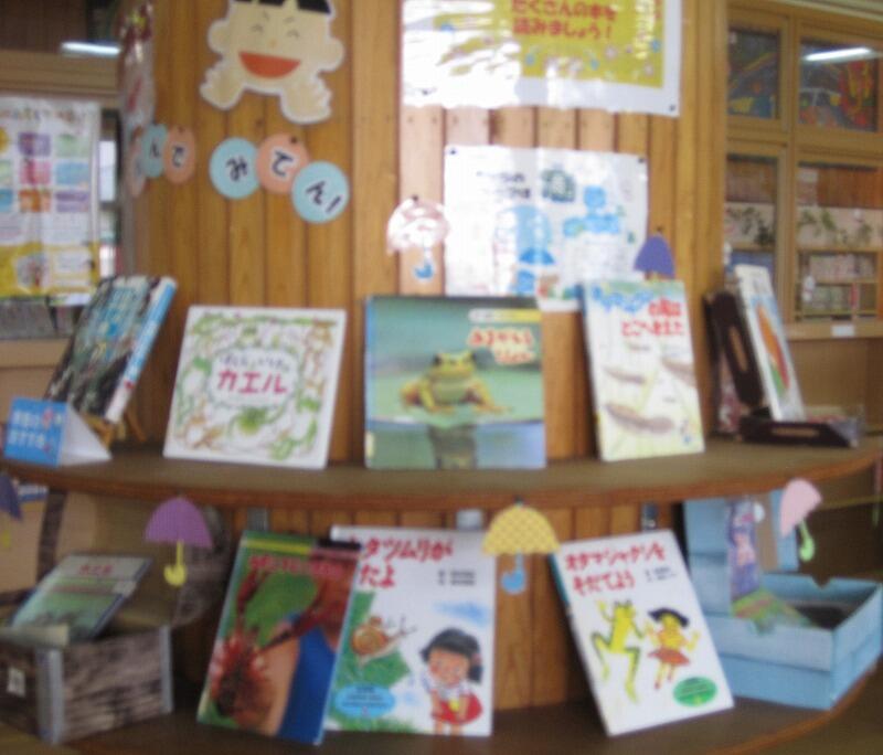 6月の学校図書館を紹介します。雨にちなんだ本の紹介コーナーや梅雨についての参考資料が掲示してあります。本をかりると朝顔が成長していくような掲示もあり、本葉が開いています。