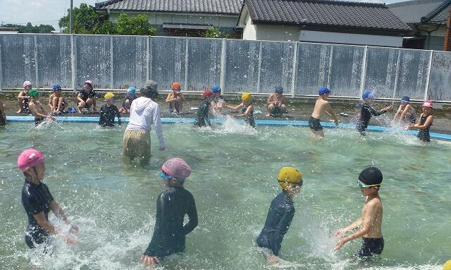 7月12日(火)、4年生がプール開きをしました。「プール使用の約束」を確認した後、シャワーで体を洗って入水しました。子どもたちは久しぶりのプールにとてもうれしそうでした。水に慣れるために、ふし浮きやけ伸びなどに取り組んでいました。
