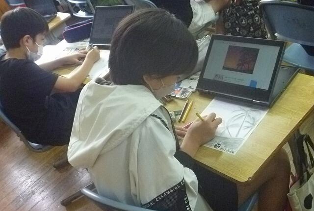 6年生は、盆地まつり灯籠プロジェクトで中央通りに設置する灯籠の絵を描いていました。タブレットPCで盆地祭りや都城市のHPを調べて、コロナに負けず皆が元気になれるような絵を考えて描いていました。