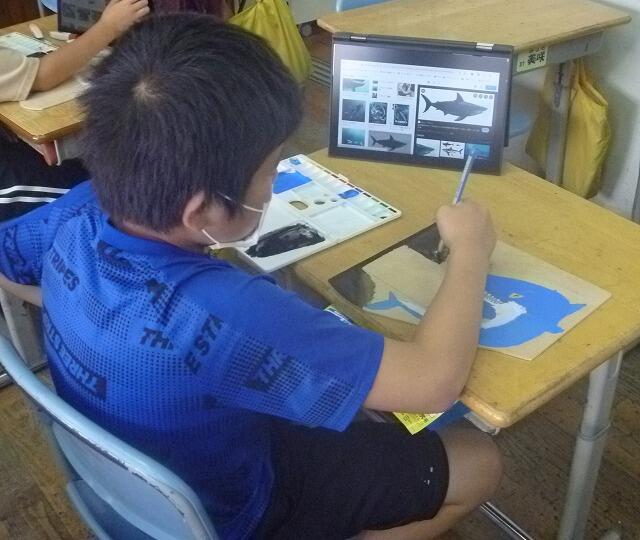 5年生は、図工でのこぎりを使った作品作りの仕上げの段階に入っていました。描きたいものの画像などを参考にしながら色ぬりをしていました。