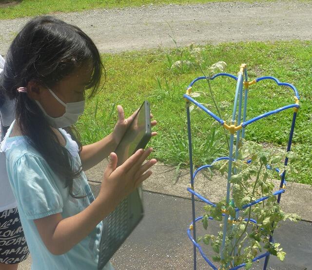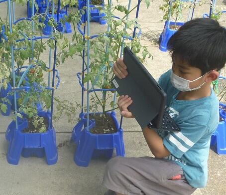 2年生が育てているミニトマトにたくさんの実がつきました。まだ青い実が多いのですが、うれしそうに観察していました。タブレットPCのカメラ機能を使って、成長の様子を記録しています。
