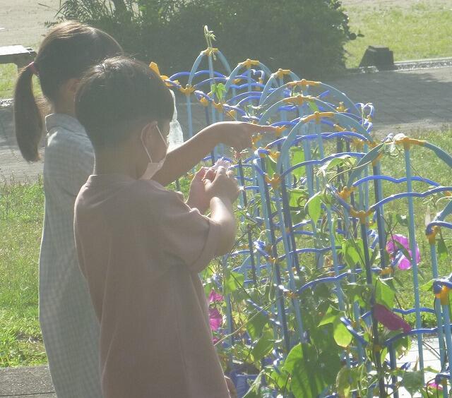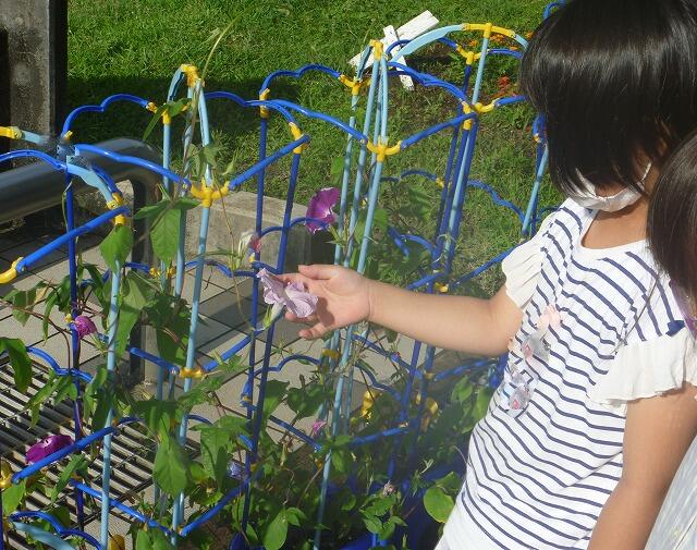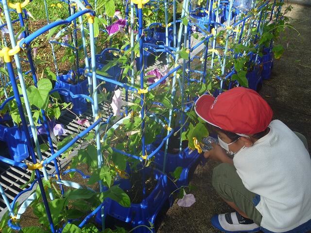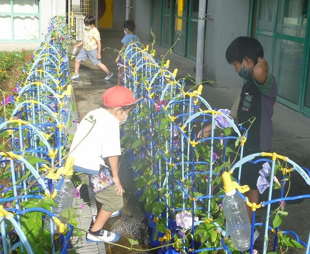 7月に入ってから、1年生が育ててきた朝顔が、色とりどりにきれいな花を咲かせています。これまで水やりのお世話をがんばってきたからでしょう。「この色がいいなあ」「青色が進化してる!」と朝顔を見ながら話している子供たちです。