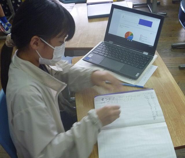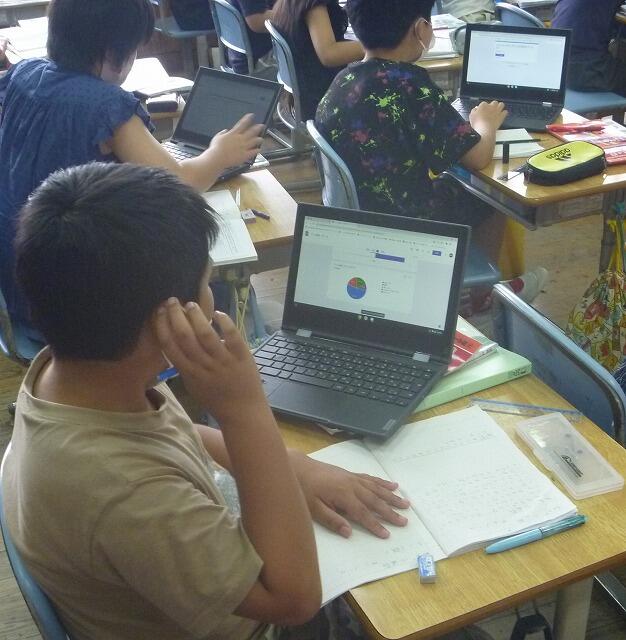 1学期のまとめに入り、どの教室を見てもこれまで以上にタブレットPCが大活躍です。先週から4年生は国語の学習で、新聞作りをしていました。グーグルフォームで学級のみんなにとったアンケートの結果をグラフにして、新聞に取り入れていました。