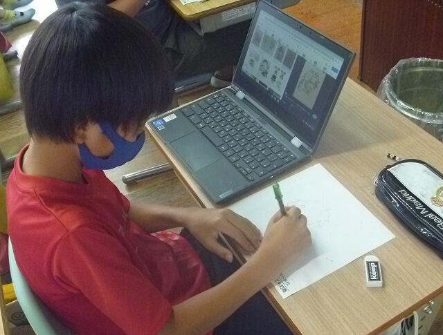 6年生は、盆地まつり灯籠プロジェクトで中央通りに設置する灯籠の絵を描いていました。タブレットPCで盆地祭りや都城市のHPを調べて、コロナに負けず皆が元気になれるような絵を考えて描いていました。
