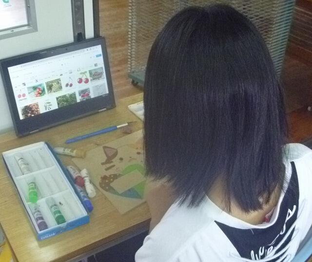 5年生は、図工でのこぎりを使った作品作りの仕上げの段階に入っていました。描きたいものの画像などを参考にしながら色ぬりをしていました。