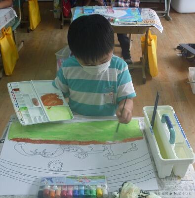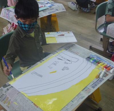 9月22日(木)、1年生が図工の学習で読書感想画の色ぬりをしていました。絵の具やクレヨンを使って、みんな集中して作品を仕上げていました。