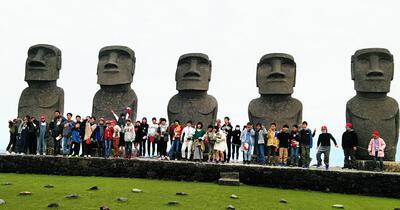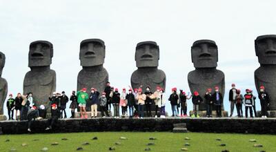 お昼ごはんを食べた後は、サンメッセ日南に来ています。海を眺めたり、モアイ像と写真をとったりしています。