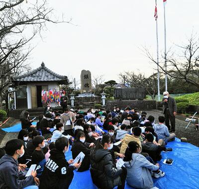 最後の目的地、宮崎空港近くの特攻隊慰霊碑に来ています。語り部の方から、戦争についてのお話を聞いています。