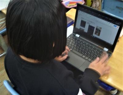 12月12日(月)、4年生が伝統工芸についてタブレットPCを使って調べたり、まとめたりしていました。都城大弓や陶芸、ガラス細工など様々な工芸品について調べ、その魅力を紹介するリーフレットを作成していました。
