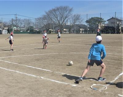 暖かい日差しを受けて、4年生が体育の学習でキックベースボールをしていました。ボールを蹴って全力で走ったり、ボールをとって投げたり、楽しそうな声が運動場に響いていました。