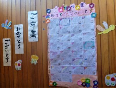今週から6年生への卒業メッセージが校内に飾られています。児童玄関の正面や6年生の教室に向かう階段の壁面などに、1~5年生が書いたメッセージが掲示してあります。6年生との楽しい思い出や感謝の気持ち、中学校でもがんばってねという応援の言葉が素敵な絵とともに心をこめて書かれてあります。