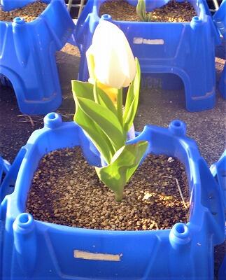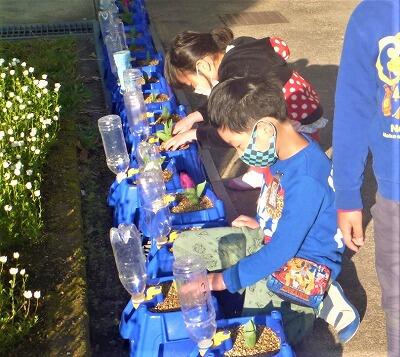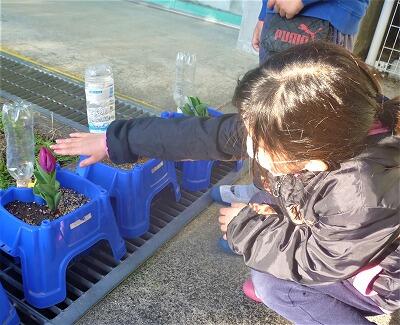 1年生が一人一鉢で大切に育ててきたチューリップに花が咲き始めました。白や赤や黄色のカラフルなチューリップをうれしそうに見せてくれました。まだ咲いていない子も「もうすぐ咲いてね」「何色でもいいからね」と、葉っぱをなでながら話しかけていました。