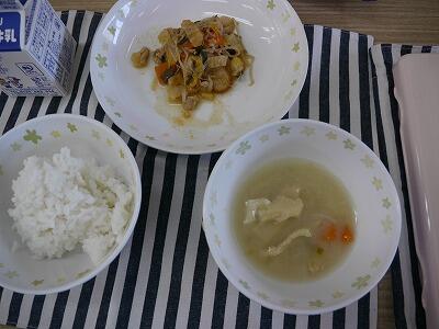 本日の献立は、「白ご飯、春野菜の味噌汁、豚キムチ」でした。