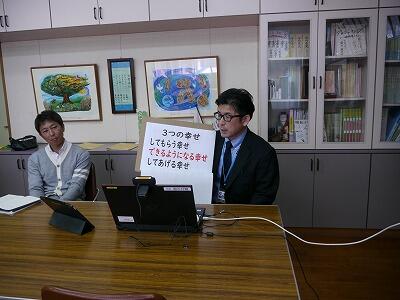 上の写真は、これまでの児童の様子を写真で説明している様子です。
