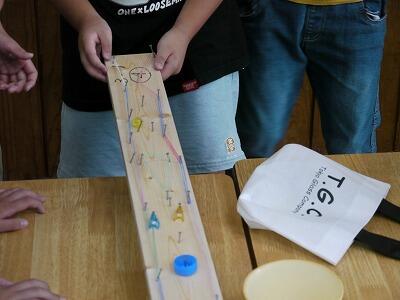 長い板に釘を打ち込んで、ビー玉を転がして遊べるおもちゃを作りました。