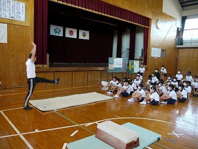 2組は体育で側方倒立回転(マット運動)の授業をしました。