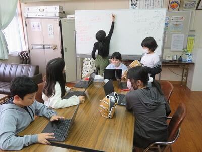 ホワイトボードにまとめる子、パソコンで、ルールを文章にまとめる子、話し合いをリードする子、疑問点を上げる子など、自然に役割分担も決まっていきます。