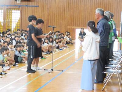 体育館での対面です。生活委員会の児童が司会進行をします。