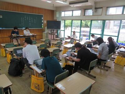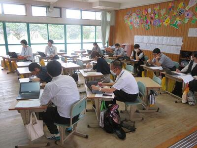 解き終わって、小中の教職員が協議をしています。