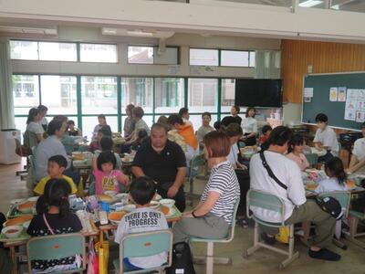 1年生は、「学年レクリエーション」として、親子で給食を一緒に食べました。