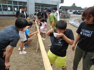 きれいに磨いた竹をみんなで並べて、つなぎます。試し流しも成功しました。