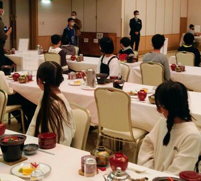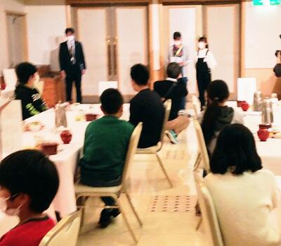 ホテルに到着。みんなとても元気です。大きなホテルにびっくりしていました。入館式をした後に夕食を食べました。