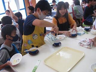 10月8日(金)、今週は5年生が家庭科で調理実習をしています。初めての調理実習です。ゆで卵とほうれん草のおひたしを作っていました。お茶の入れ方も学習して、友達についであげていました。「お茶がおいしい~」の声がいっぱい。肝心のゆで卵とほうれん草は・・・お家でもぜひ作ってみて味見してください!