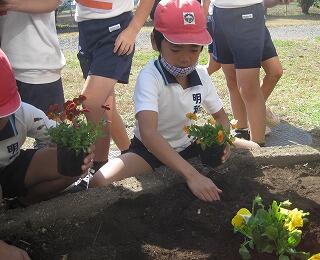 11月15日(月)、2年生と4年生が花の苗植えをしていました。春に咲くビオラやパンジー、ノースポールの花を学級園に植えました。また、卒業式で飾るために一人一鉢でビオラも植えていました。みんなていねいに優しく植えていました。