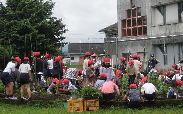6月15日(水)、3年生が総合的な学習の時間できゅうりやミニトマト、なす、トウモロコシなどの野菜を育てています。今日は野菜作りの先生として地域の方が3名来られました。育て方のアドバイスをくわしく教えていただきました。(途中でガネザウルスも登場!)