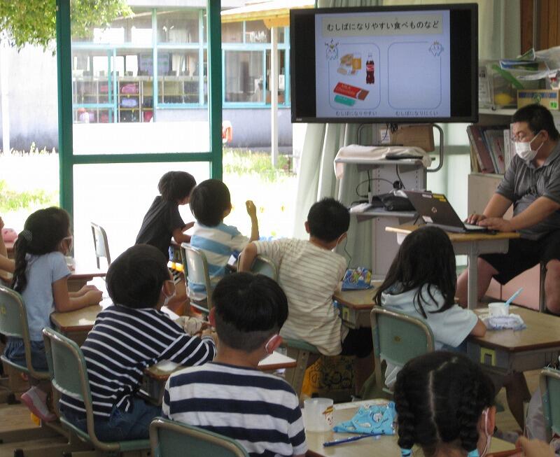 昨日、歯と口の健康週間に合わせて1年生が歯みがきの練習をしました。むし歯ができる原因や歯みがきの大切さについて動画で学んだ後に、正しい歯みがきの仕方を練習しました。