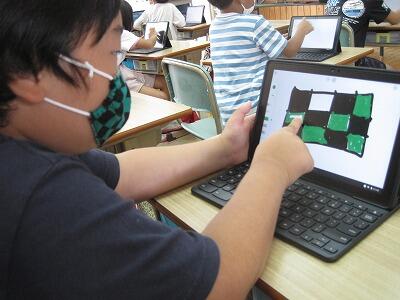 9月3日(金)、1年生が初めてタブレットPCを使いました。みんな笑顔でタブレットPCを触るだけで歓声が上がります。自分でパスワードを入れてログインしたり、クラスルームに入ったり・・・一つ一つ確かめながら全員ができると拍手が起こっていました。最後は、ひらがなを書いたり、お絵かきをしたり楽しそうに使っていました。