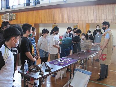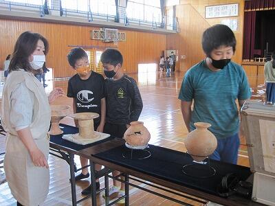 6月1日(火)は、6年生が体育館で歴史の学習をしていました。市の文化財課から5名が来校されて、縄文時代、弥生時代、古墳時代の生活等について教えてくださいました。市内で発掘された2千年前の土器のかけらや米、どんぐりなど、実際に見たり触れたりしながら学習しました。本校から出てきた土器等も見せていただき、みんな驚いていました。
