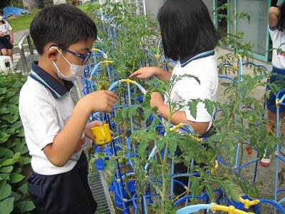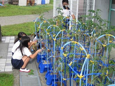 7月7日(水)、朝から2年生のうれしそうな声が聞こえてきます。お世話をして育ててきたミニトマトに、たくさんの実がついています。「これを見てください」とたくさんの子どもが教えてくれました。赤く熟すのを楽しみに待っているようです。