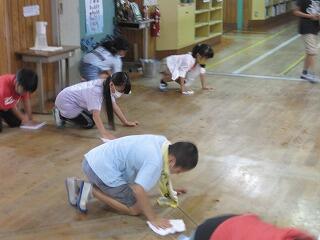 10月4日(月)、先週から清掃が始まりました。全校一斉に清掃をするのは約1か月ぶりです。みんな黙々と清掃に取り組んでいます。廊下や階段などていねいに雑巾で拭いていました。1年生も力を合わせて掃除を頑張っていました。
