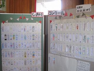 10月は、本のしおりコンクールがありました。図書委員会がしおりのイラストを募集したら160枚ほど集まりました。それらを掲示して、先週末まで投票が行われました。休み時間には、しおりを選ぶ子どもが多く見られました。今週は集計期間で、上位10枚は11月の読書月間のしおりになります。