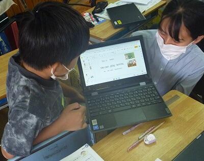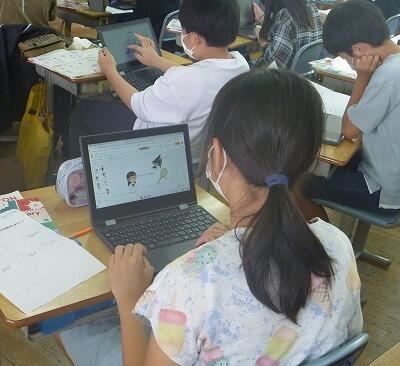 5年生が、英語で友達や家族などを紹介する学習をしています。それぞれの人物の特徴がわかるように、簡単なプレゼンを作成して紹介していました。英語でプレゼンでと、いろいろな力を総合的に使って活動していました。