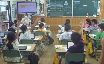 10月5日(水)は、1年生と2年生の研究授業がありました。問題解決に向け、自分で考え、友達との話合いを通じて考えを深めたり広げたりする学習をしています。1年生は「3つの数の計算」で、ブロックを動かしながら計算の仕方を友達に説明していました。2年生は「かけ算」の学習で、ジャムボードやグーグルフォームを使いこなしながら全員の考えを交流することができました。