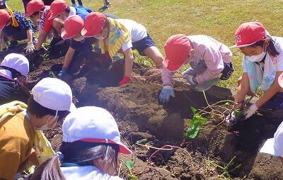 10月19日(水)、2年生が生活科の学習で育ててきたさつまいもの収穫をしました。みんな嬉しそうに掘っていました。大きなさつまいもがたくさん掘れて、にこにこ笑顔でした。