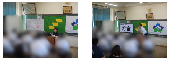 2人目の先生は、大学時代の経験をもとに、宮崎の方言と他県の言葉の違いについて話をしてくださいました。出雲弁では語尾が「〜だに」「〜だが」となることや、連続テレビ小説のタイトルにもなった「だんだん」という言葉の意味についても紹介してくれました。「だんだん」とは「ありがとう」という意味なのだそうです。聞いたことのない言葉の面白さに、会場は笑顔で包まれました。先生は最後に「同じ日本人でも、地域によって言葉や文化はさまざま。違いを受け入れながら人と関わっていくことが大切です」とまとめられました。