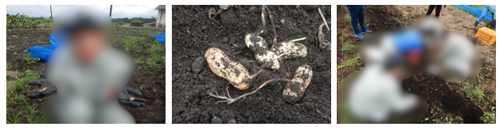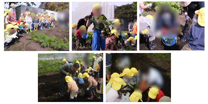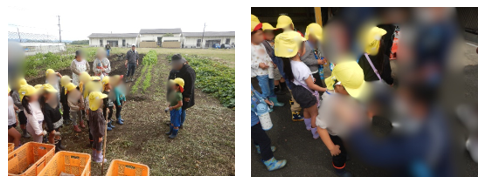 交流会の後半は学校の農場でのじゃがいも掘り体験です。スタートの合図とともに園児たちは一斉に駆け出し、夢中になって土を掘り返していました。小さな手で一生懸命じゃがいもを探す姿はとても微笑ましく、あちこちから楽しげな笑い声が響き渡りました。たくさんのじゃがいもが収穫され、その日のうちに、園に届けられました。園児たちが家でおいしく食べてくれることを願っています。