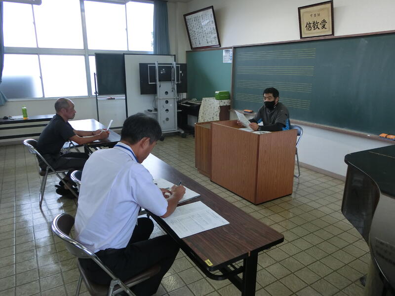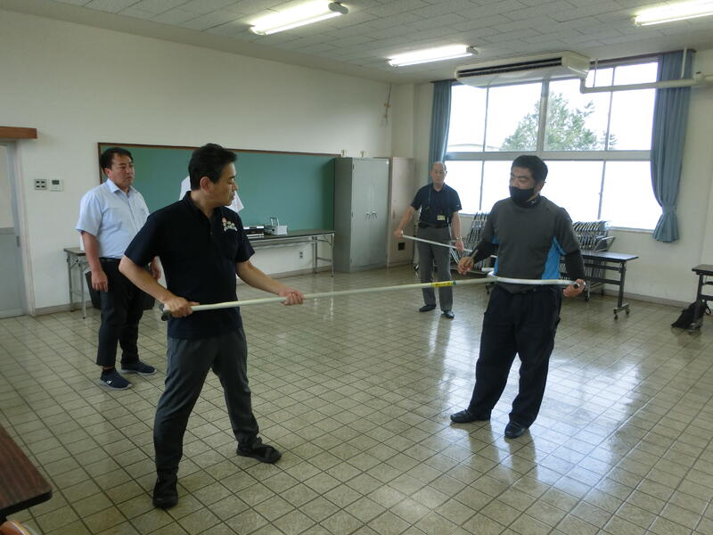 8月24日(木)、都城警察署生活安全課係長佐藤栄三様、スクールサポーターの丸山文広様を講師としてお招きして、職員向けの不審者対応訓練を実施しました。まず最初に、都城警察署管内の刑法犯罪認知状況について説明をしていただいた後に、実技・訓練を行っていただきました。