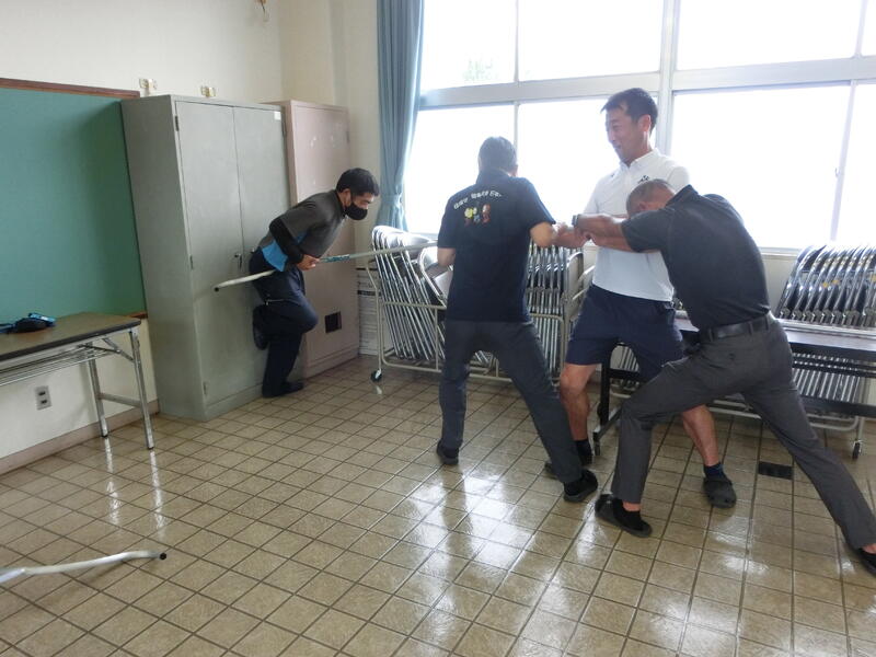 実技・訓練では、不審者発見時の初期対応や対峙する際の身の安全を確保するための方法、通報の仕方についてなど教えていただきました。具体的にさすまたの使い方や使う際の留意点、身近にある机や椅子の使い方、消火器の効果的な使い方、複数での対応の仕方、護身術などを丁寧に教えていただきました。