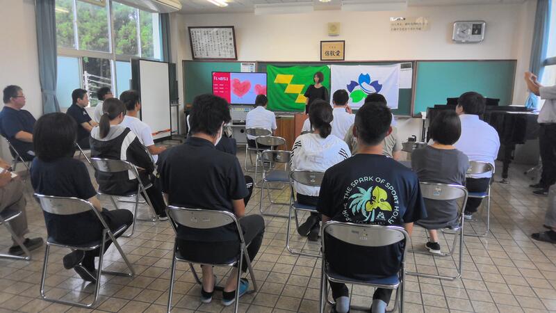 この全校朝会には、生徒と白雲小中学校の職員に加え、県立みやざき学園の先生方にも参加していただいています。生徒と職員がみんなでいのちについて考える全校朝会となりました。