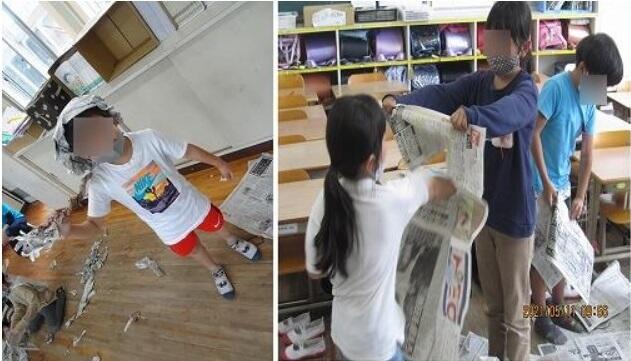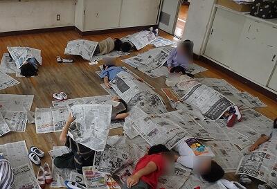 教室の床に新聞紙を敷いてその上に寝転ぶ・・・そんな、非日常のひとときに子どもたちは大興奮でした!