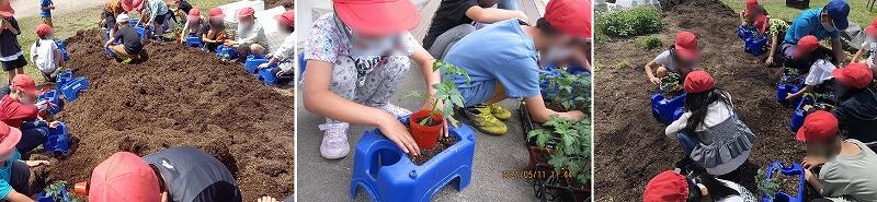 1,2組は昨日。そして、3組が今日、ミニトマトの苗を鉢に植えました。