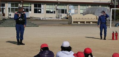 を挙げて、話をしてくださいました。そして、消火訓練です。3年生から6年生までの4人の人が